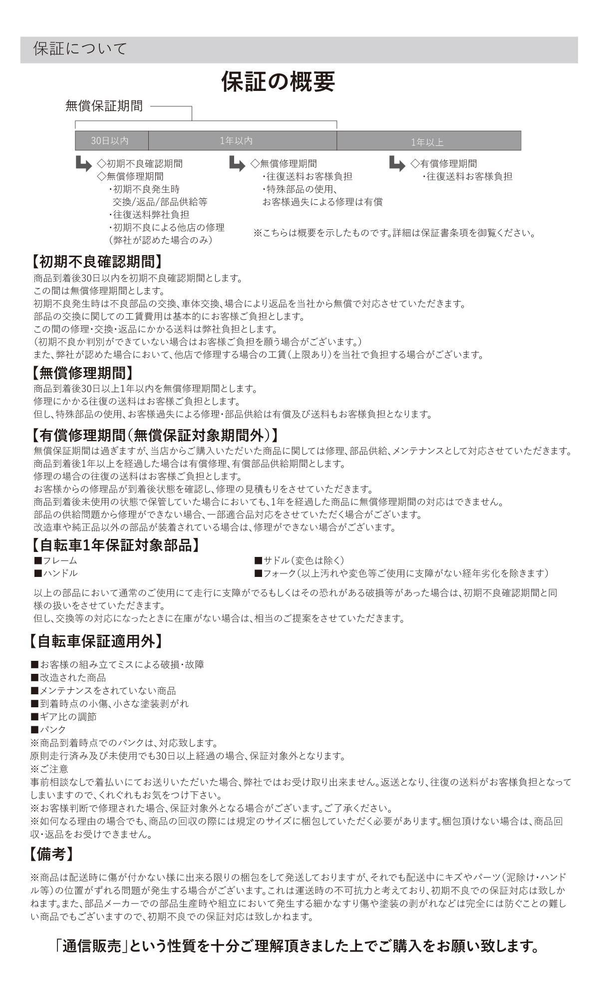 万が一、商品の破損、欠陥や不良等がございましたら、自転車は商品到着から30日以内に、自転車以外は7日以内に当店までご連絡ください。