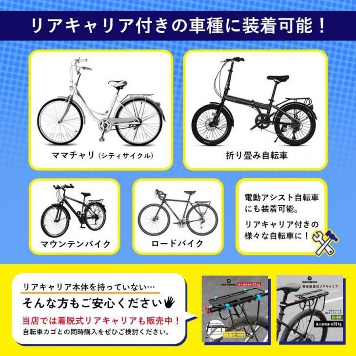 ママチャリ(シティサイクル)はもちろん、折りたたみ自転車や電動アシスト自転車などリアキャリア付きのさまざまな自転車に対応。