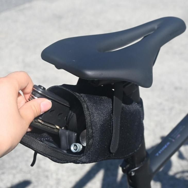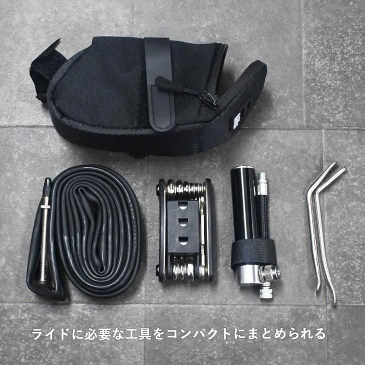 内部には小物用のポケットとストラップがあり、チューブやタイヤレバー、携帯工具などを整理しやすく、必要な時にすぐ取り出せる設計です。