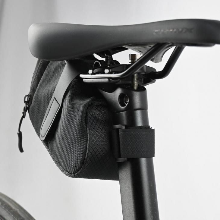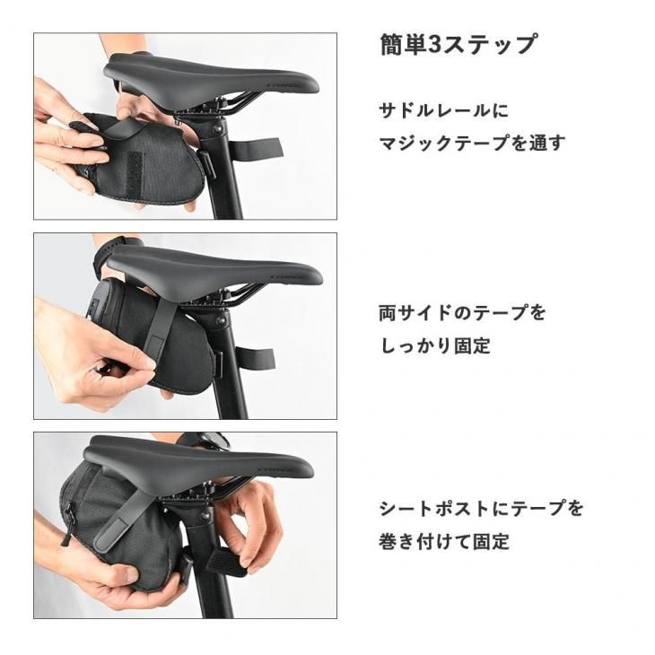 取り付けは、サドルレールとシートポストに3本のベルクロストラップを使うだけで、工具なしで素早く確実に固定できます。
